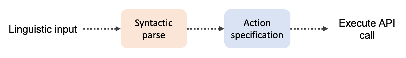 Now, such a system could fail in at least two obvious ways. First, our grammar might fail to identify a suitable syntactic parse, i.e., there is no grammatical rule that produces a complete analysis of the sentence. And second, even if we produce a syntactic analysis, our system for producing an action specification might not “know” what to do with that analysis—or which API calls to make. In both cases, the user of the system has produced a sentence that the system does not “understand” in the sense that no suitable output is produced.