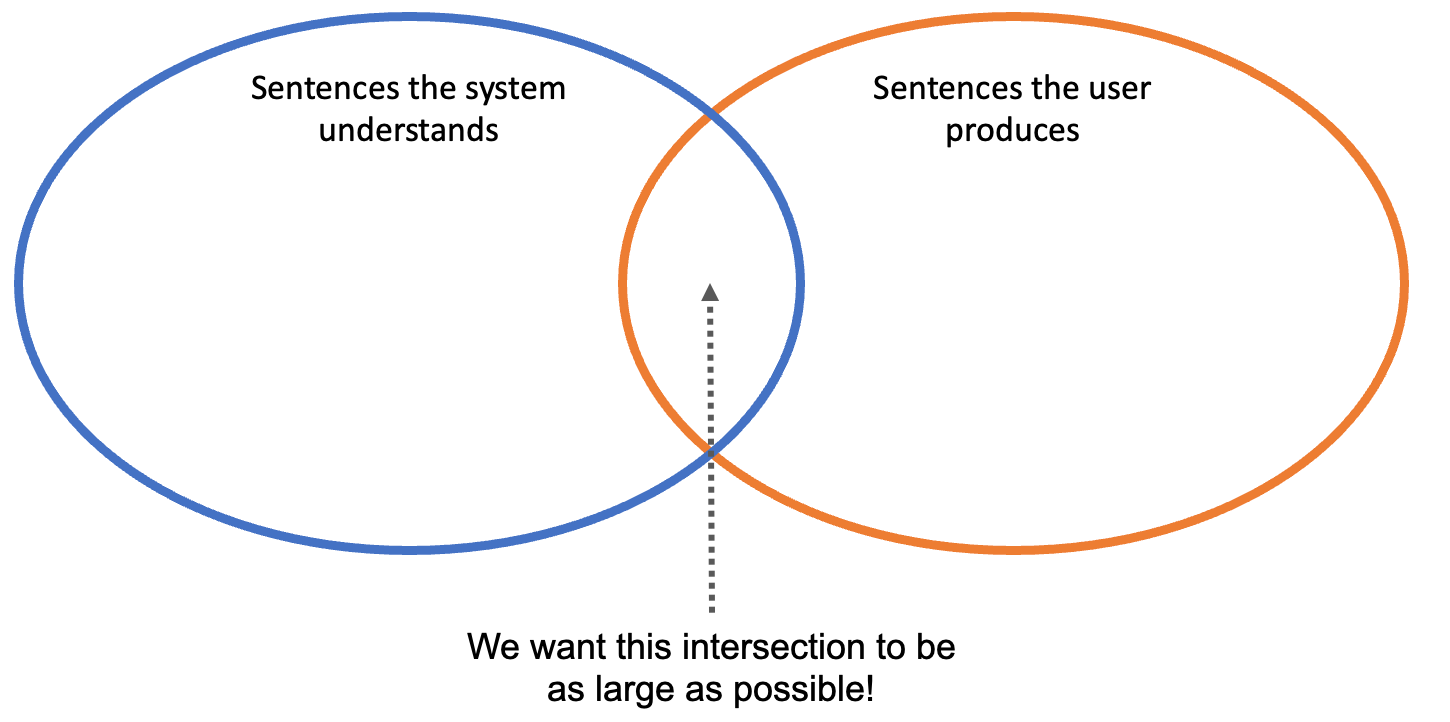 It might help to depict this problem visually. We can think of two “sets” of sentences: first, sentences the system understands (i.e., produces the correct action from linguistic input); and second, sentences the user produces (i.e., commands or “intended actions”). In the ideal case, these two sets should have complete overlap—everything the user produces should be comprehensible by the system, and everything the system can do is (at least in principle) accessible to the user. In other words, we want the intersection between these sets to be as large as possible.