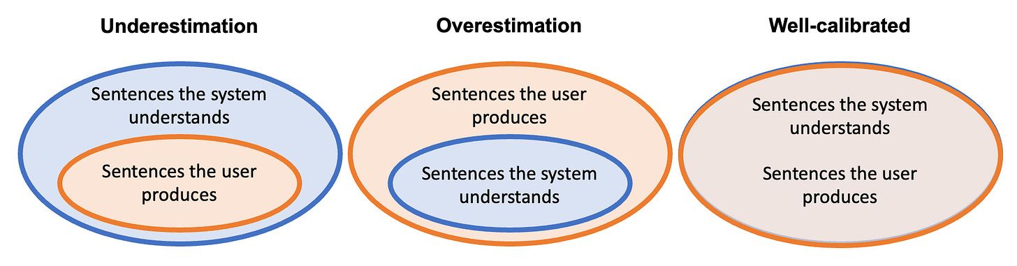 Framing it this way allows us to flesh out what we mean by underestimation and overestimation. In this framework, underestimation occurs when the set of sentences a system understands is larger than the set of sentences the user produces; overestimation is when the set of sentences a user produces is larger than the set of sentences a system understands. Finally, appropriate calibration is when these sets are, effectively, identical.