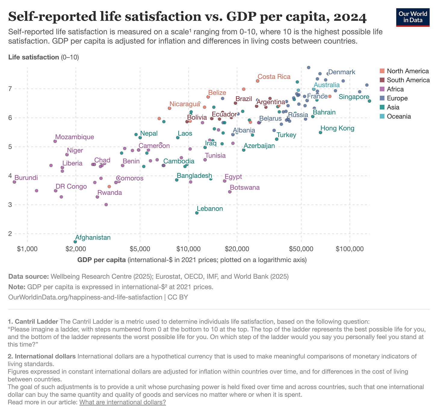 So far, my definition of associational claims has been rather abstract. But you likely encounter associational claims all the time: anytime two or more variables are described as being related to each other (though not necessarily in a causal relation), that’s an associational claim. For example, Our World in Data contains a scatterplot showing the relationship between GDP per capita and self-reported life satisfaction, depicted below.