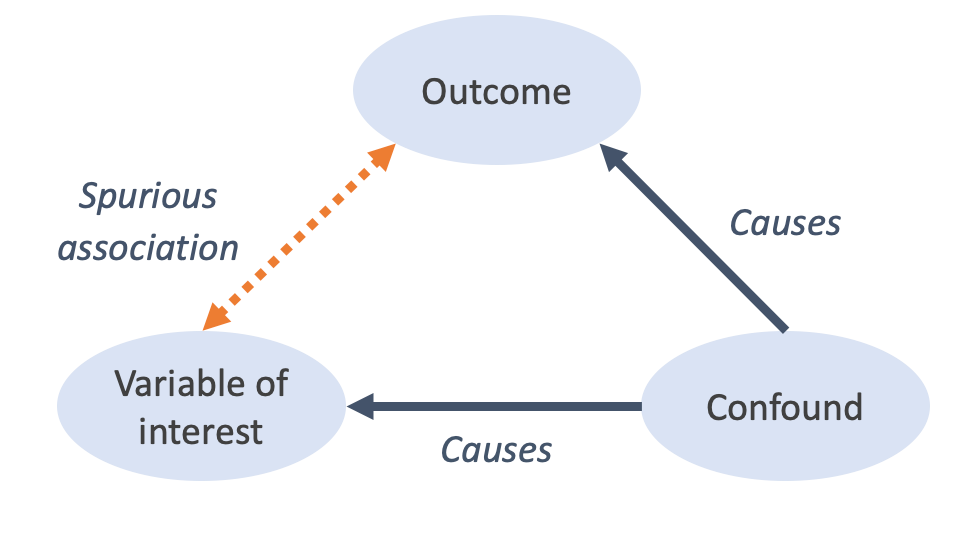 A confound is simply a variable that affects both the outcome variable (B) and the explanatory variable of interest (A). If some confound C causes changes in both A and B, it is plausible that A and B will be correlated even if they are causally unrelated. Crucially, if we fail to account for C—either in our experimental design or in our statistical analysis—we might infer that A and B are in fact causally related.5